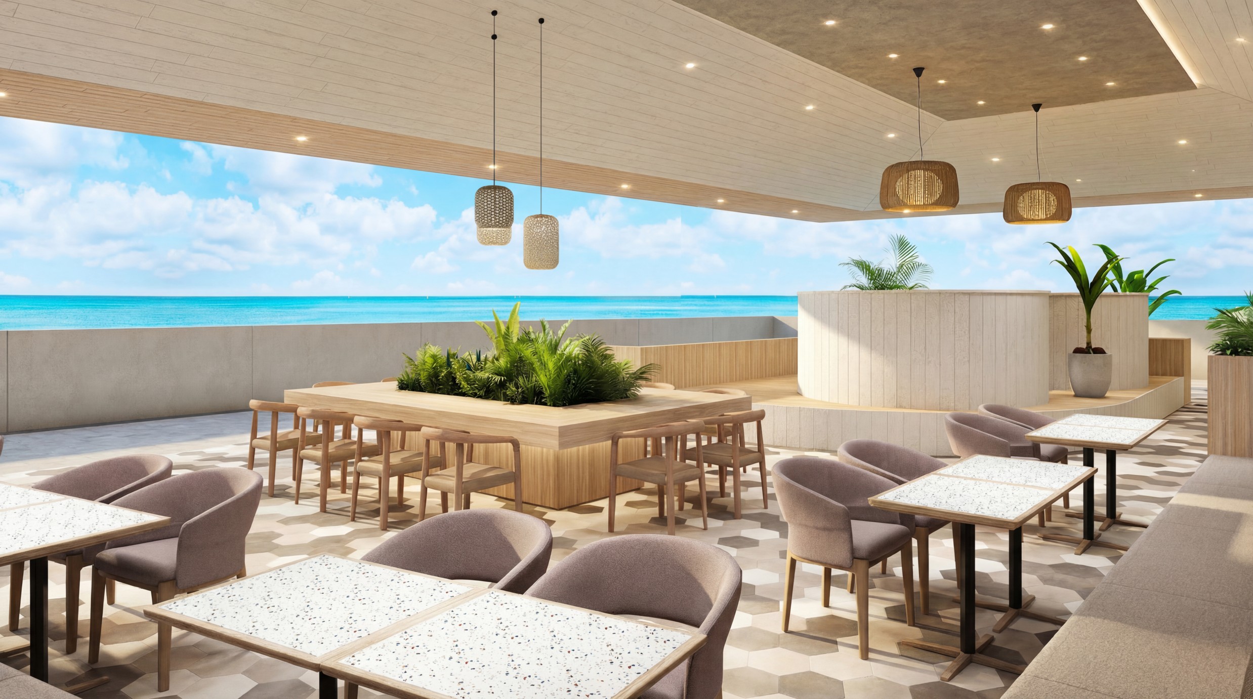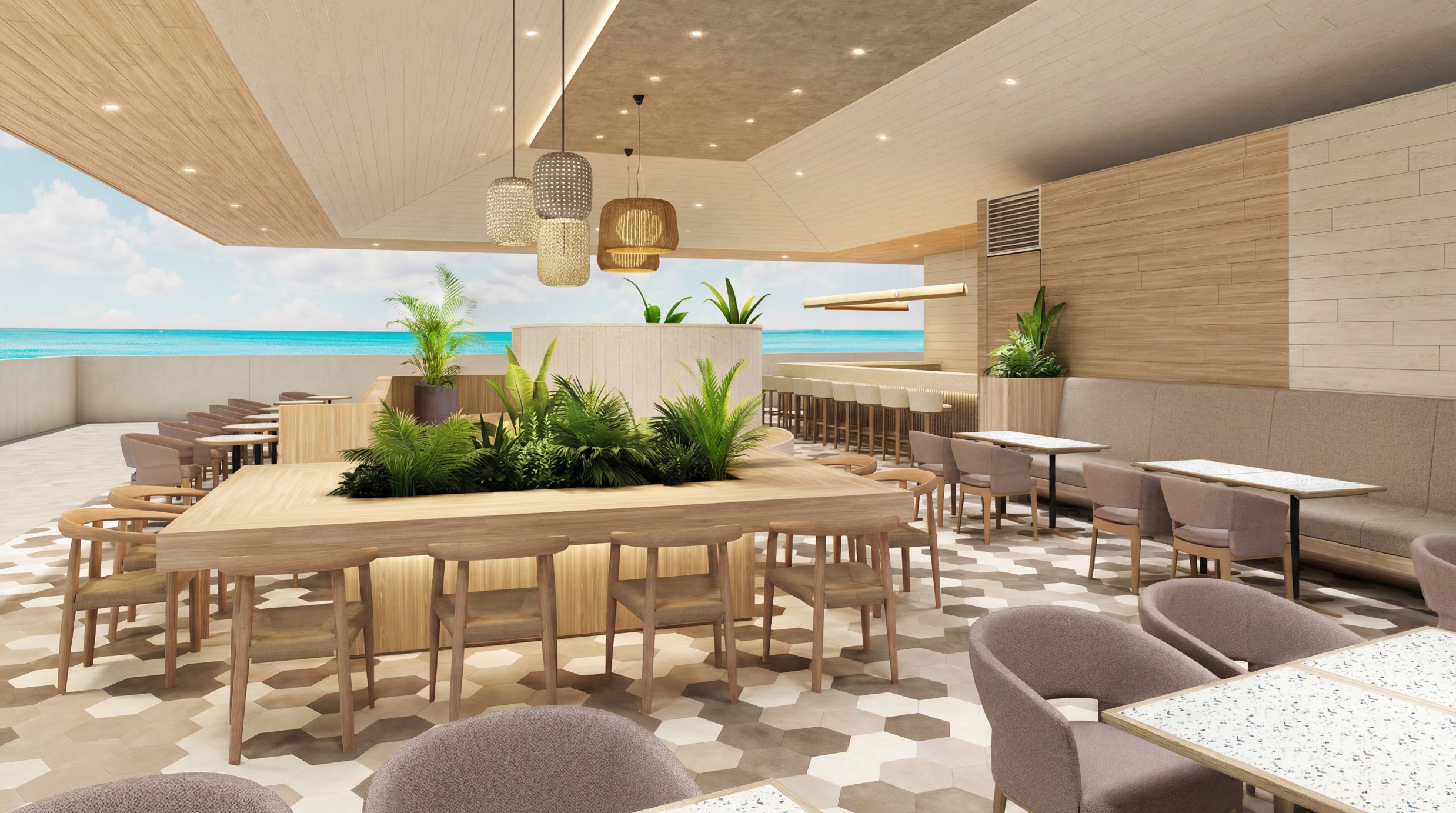 天井や壁、床の仕上げ素材は色数を必要最小限に抑え、開放感が高く爽やかで上質な空間に仕上げている。客席はカウンター席をはじめ、バリエーション豊かに配置し、どの席からもオーシャンビューを楽しめるようにレイアウトしている。優雅な時間を過ごせるよう、客席スペースにはゆとりを持たせている。