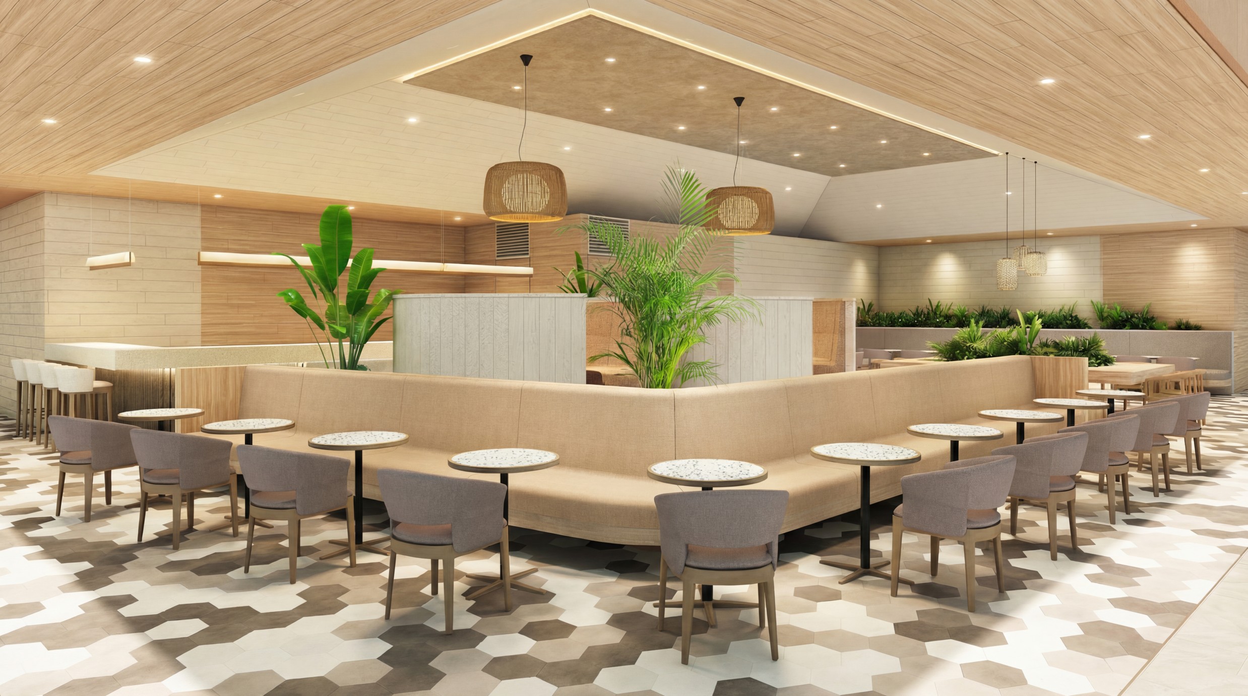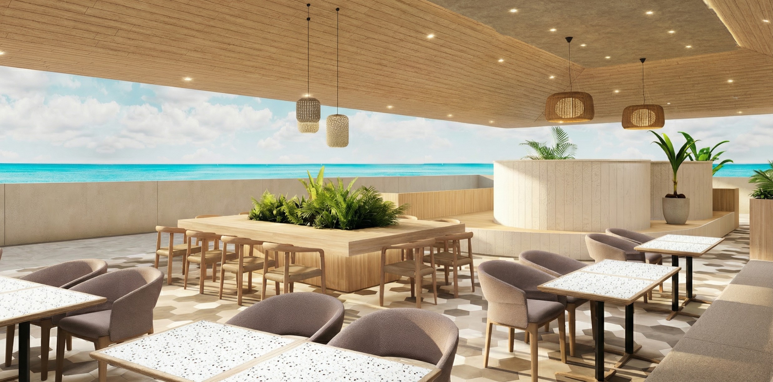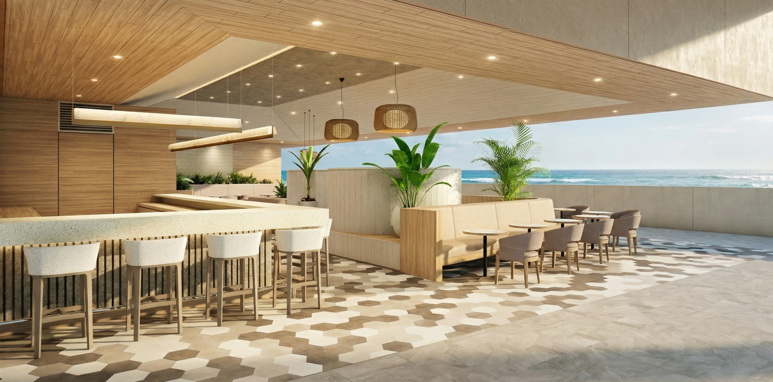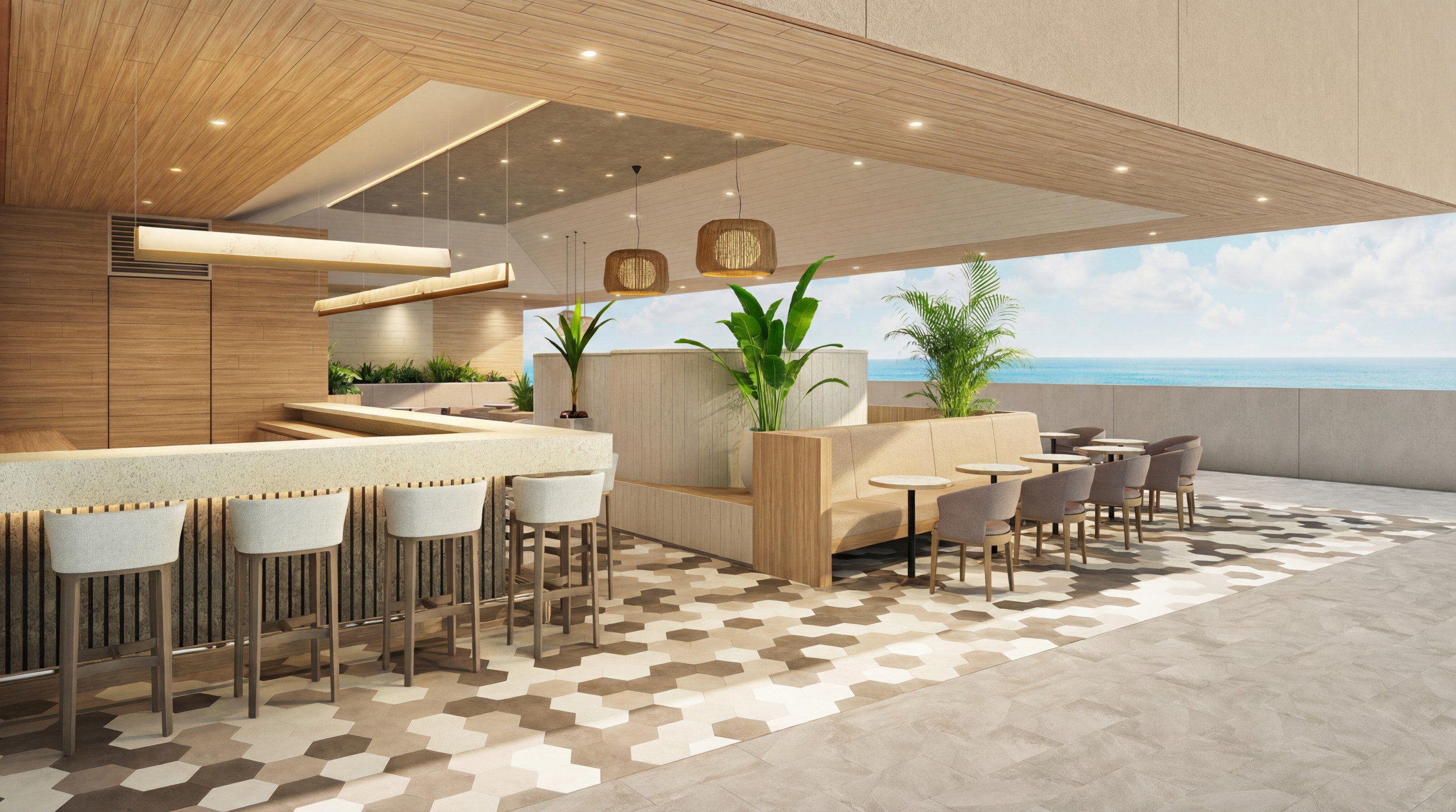 The finishing materials for the ceilings, walls, and floors are kept to a minimum, creating an open, refreshing, and high-quality space. The seating area offers a variety of options, including counter seats, and is laid out so that every seat offers an ocean view. The seating area is spacious, allowing guests to enjoy a relaxing time.